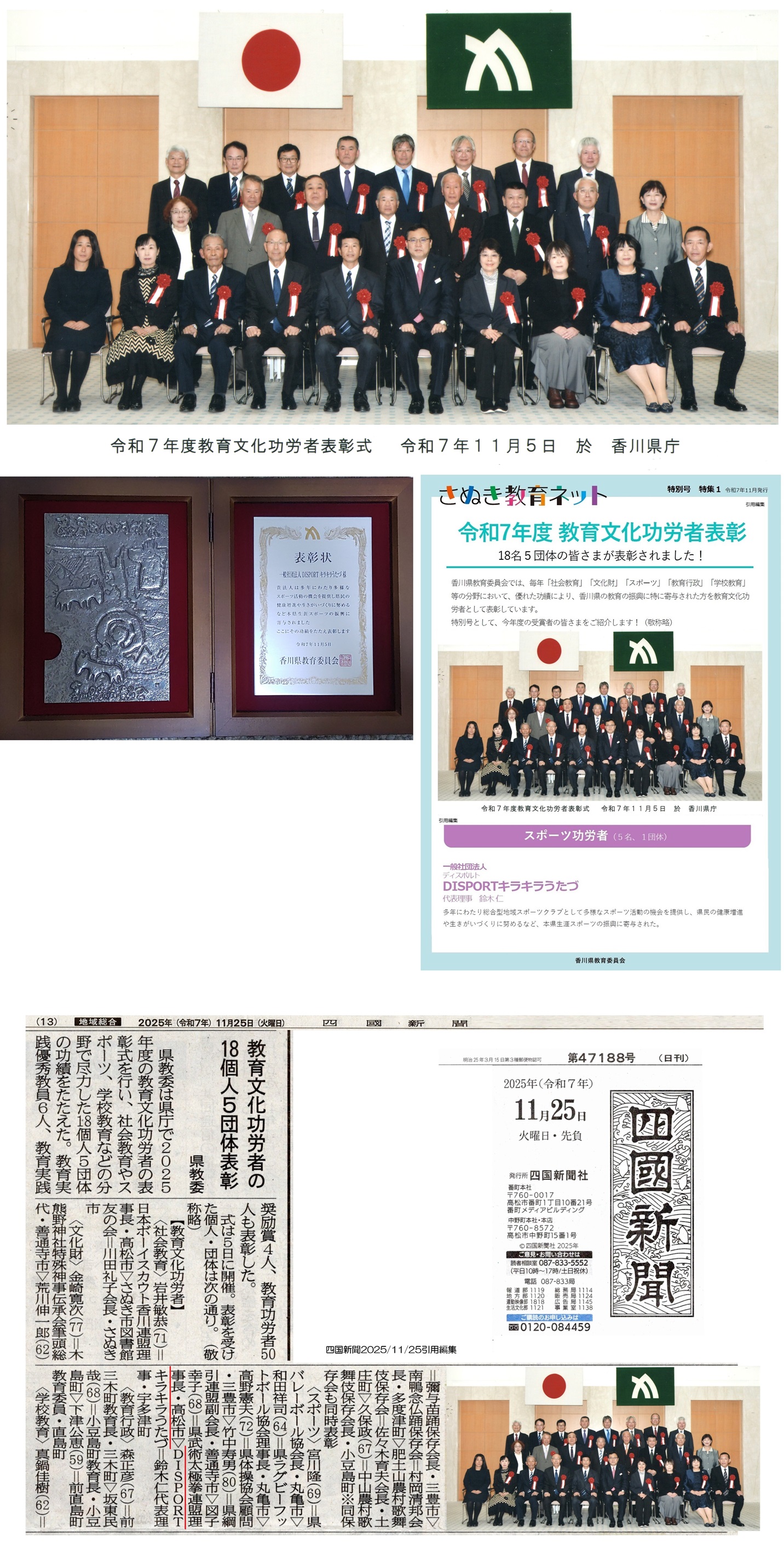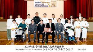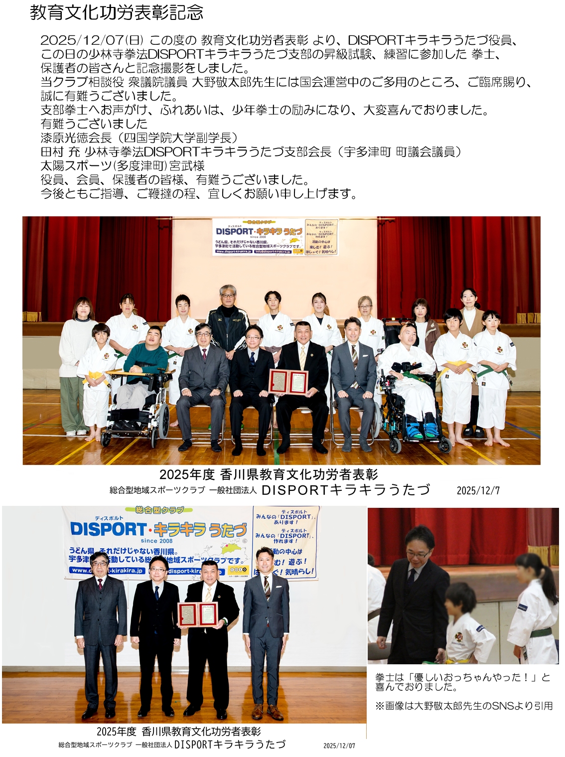 2025/12/07(日) この度の 教育文化功労者表彰 より、DISPORTキラキラうたづ役員、この日の少林寺拳法DISPORTキラキラうたづ支部の昇級試験、練習に参加した 拳士、保護者の皆さんと記念撮影をしました。