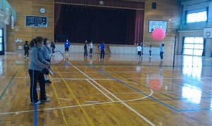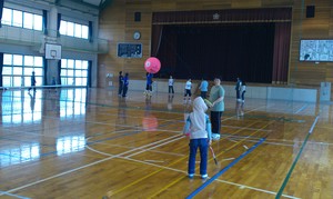 ミニテニスは初心者と経験者でラリーが続くように練習しました。キンボールはボールに慣れてもらうため、レシーブの練習メインで行いました。最後に試合をして、ゲームの雰囲気を体験してもらいました。