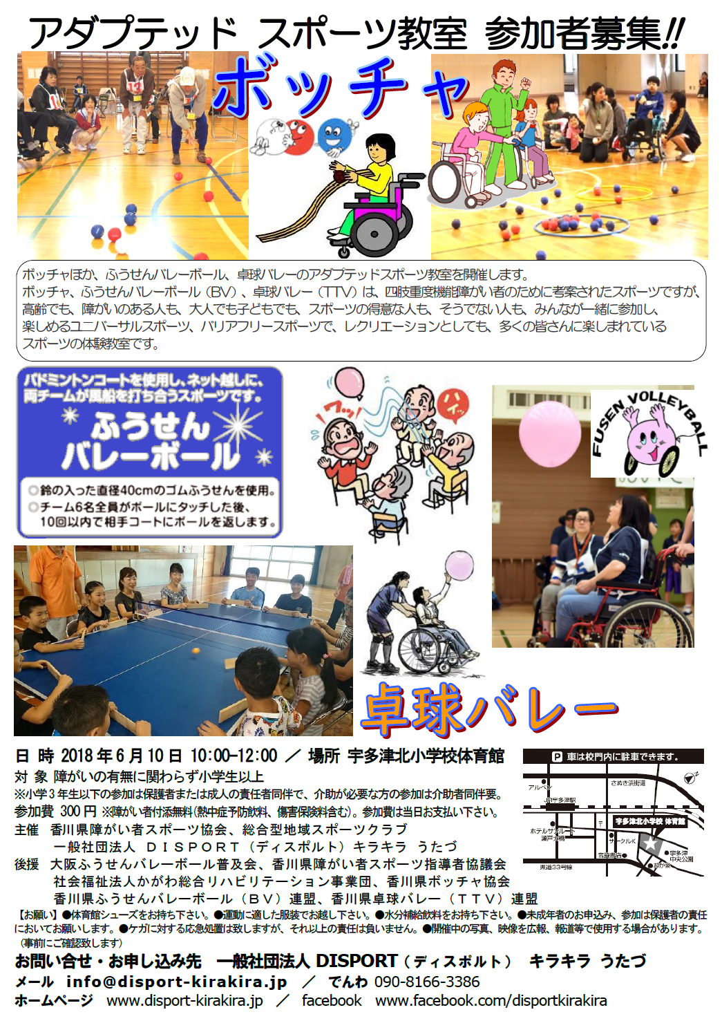 ボッチャほか、ふうせんバレーボール、卓球バレーのアダプテッドスポーツ教室を開催します。ボッチャ、ふうせんバレーボール(BV)、卓球バレー(TTV)は、四肢重度機能障がい者のために考案されたスポーツですが、高齢でも、障がいのある人も、大人でも子どもでも、スポーツの得意な人も、そうでない人も、みんなが一緒に参加し、楽しめるユニバーサルスポーツ、バリアフリースポーツで、レクリエーションとしても、多くの皆さんに楽しまれているスポーツの体験教室です。